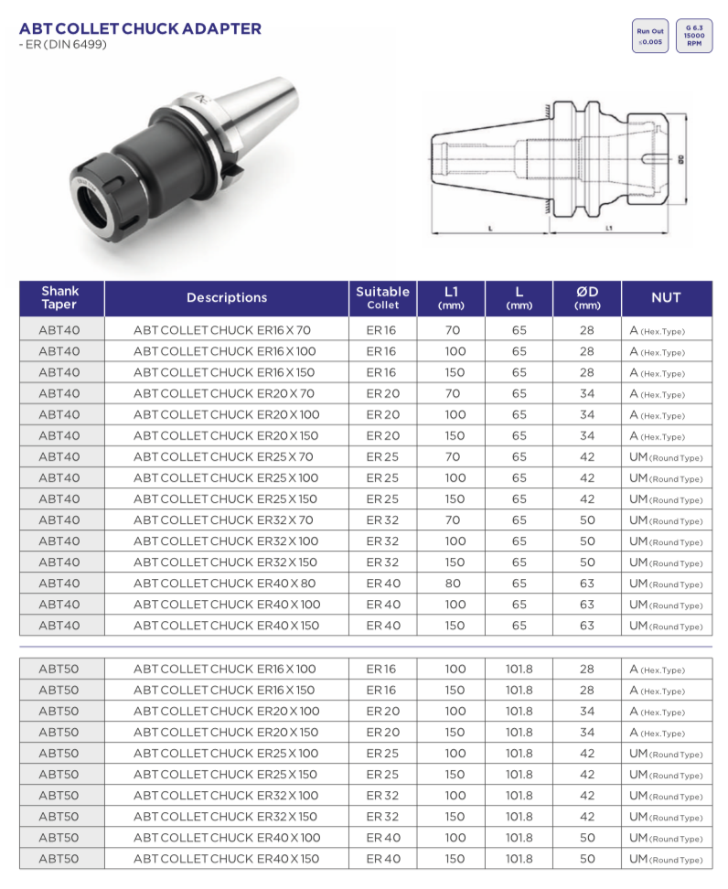 The ABT Collet Chuck Adapter ER (DIN 6499) is a high-precision tool holding solution designed for accurate and secure clamping of cutting tools in CNC machining operations. At Sai Truman Enterprises, Bhosari, Pune, we provide a wide range of ABT40 and ABT50 collet chuck adapters that are engineered for superior performance, durability, and reliability. Manufactured using high-quality hardened alloy steel, these adapters ensure excellent rigidity, minimal runout, and long-lasting performance even in high-speed machining environments. Our ABT collet chuck adapters are compatible with various ER collet sizes including ER16, ER20, ER25, ER32, and ER40, offering flexibility for different tool diameters and applications. Available in multiple length configurations, these adapters are designed to meet diverse machining requirements while maintaining optimal balance and stability. The precision-ground taper and adherence to DIN 6499 standards ensure perfect alignment, easy installation, and consistent clamping force, resulting in improved machining accuracy and superior surface finish. Ideal for applications in automotive, aerospace, die & mold, and general engineering industries, these collet chuck adapters enhance productivity by reducing tool vibration and ensuring firm grip during operations. At Sai Truman Enterprises, we are committed to delivering high-performance tooling solutions that help reduce downtime and increase efficiency. Choose our ABT Collet Chuck Adapters for dependable performance, precise machining, and excellent results in every application.