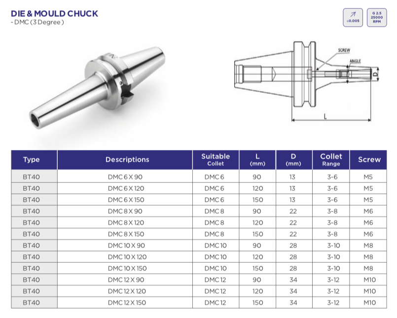 Sai Truman Enterprises, based in Bhosari, Pune, offers premium-quality Die & Mould Chucks (DMC – 3 Degree) designed for high-precision CNC machining applications. These BT40 tool holders are engineered to deliver excellent accuracy, stability, and superior gripping performance for die and mould machining. Manufactured with high-grade materials, our DMC chucks ensure long tool life and reduced vibration even at high spindle speeds. The 3-degree design provides enhanced clamping force, making them ideal for heavy-duty cutting operations. Available in multiple sizes such as DMC 6, DMC 8, DMC 10, and DMC 12, these chucks support a wide collet range for versatile machining needs. With length options ranging from 90 mm to 150 mm, customers can select the perfect configuration for their setup. Our Die & Mould Chucks are compatible with industry-standard BT40 machines, ensuring easy integration. Precision-balanced construction allows smooth performance at high RPM, improving machining efficiency. These tool holders are widely used in automotive, aerospace, and tool room industries. Each unit undergoes strict quality checks to meet international machining standards. Sai Truman Enterprises ensures reliable supply and competitive pricing for all tooling requirements in Pune and across India. Our expert team helps customers choose the right chuck based on their machining applications. Upgrade your CNC tooling setup with our durable and high-performance Die & Mould Chucks. Contact Sai Truman Enterprises in Bhosari, Pune today for the best deals on precision tool holders.