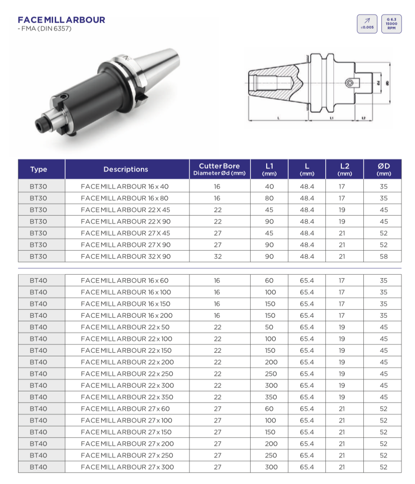 At Sai Truman Enterprises, Bhosari Pune, we offer premium-quality Face Mill Arbours designed as per DIN 6357, ensuring precision, durability, and reliable machining performance. These arbors are ideal for mounting face milling cutters securely, delivering excellent stability and reduced vibration during heavy-duty milling operations. Available in popular taper types like BT30 and BT40, our Face Mill Arbours cater to a wide range of CNC machines and industrial applications. With cutter bore diameters ranging from 16 mm to 32 mm and multiple length options, customers can select the perfect configuration for their specific machining requirements. Manufactured using high-grade alloy steel, these arbors provide superior strength, wear resistance, and long service life even under high-speed conditions. The precision-ground surfaces ensure accurate alignment, improving machining efficiency and surface finish quality. Our products are suitable for industries such as automotive, aerospace, tool rooms, and general engineering workshops. At Sai Truman Enterprises, we focus on supplying reliable tooling solutions that enhance productivity and reduce downtime. Whether you need short or extended length arbors, we maintain ready stock and ensure quick availability in Pune and nearby industrial areas. Choose our Face Mill Arbours for consistent performance, robust construction, and cost-effective machining solutions tailored to your needs.