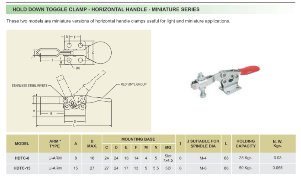 Sai Truman Enterprises, Bhosari Pune offers high-quality Miniature Hold Down Toggle Clamps (Horizontal Handle Series) designed for precision clamping in light-duty industrial and workshop applications. These compact clamps feature a durable metal body, stainless-steel rivets, and a comfortable red vinyl grip for safe and reliable operation. Ideal for jigs, fixtures, woodworking, and fabrication setups, they provide strong holding capacity while saving space in tight work areas. Available in models like HDTC-8 and HDTC-15, the clamps support spindle sizes from M4 to M6 with holding capacities up to 50 kg. Their sturdy mounting base ensures easy installation on worktables, machines, and fixtures. Get dependable clamping solutions for engineering, manufacturing, and tooling needs at Sai Truman Enterprises, Bhosari, Pune.