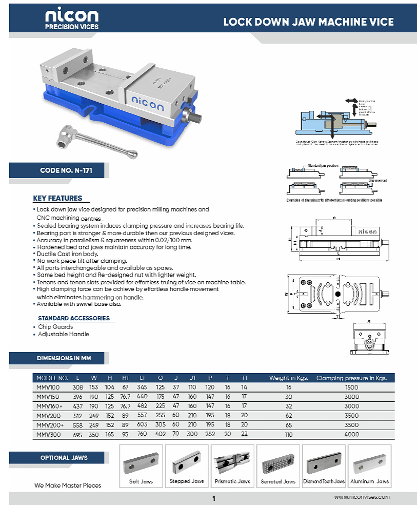 At Sai Truman Enterprises, Bhosari Pune, we offer the high-precision Nicon Lock Down Jaw Machine Vice designed for modern milling and CNC machining applications. This robust machine vice ensures superior clamping stability, making it ideal for precision engineering and production environments. Its sealed bearing system enhances durability while maintaining consistent clamping pressure over extended use. Manufactured with hardened bed and jaws, it delivers long-lasting accuracy and resistance to wear and tear. The ductile cast iron body provides excellent strength, ensuring vibration-free machining operations. With high squareness accuracy up to 0.02/100 mm, it guarantees precise alignment for critical jobs. The lock-down jaw mechanism eliminates workpiece lifting, ensuring firm and reliable gripping every time. Its lightweight redesigned nut and smooth handle movement allow effortless operation without hammering. Interchangeable components and available spare parts make maintenance simple and cost-effective. The vice is equipped with tenons and slots for easy alignment on machine tables, saving setup time. Available in multiple sizes and clamping capacities, it suits a wide range of industrial applications. Optional jaws like soft, stepped, serrated, and diamond teeth jaws provide versatility for different materials. Whether you run a small workshop or a large CNC facility, this vice enhances productivity and precision. Choose Sai Truman Enterprises in Pune for reliable quality, competitive pricing, and trusted industrial tooling solutions.