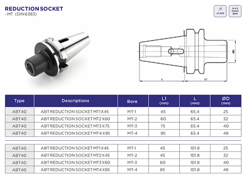 At Sai Truman Enterprises, Bhosari Pune, we offer high-quality Reduction Sockets designed for precision machining and reliable tool holding. These sockets conform to **DIN 6383**, ensuring compatibility with industry-standard machines. Our ABT40 Reduction Sockets are engineered to adapt larger spindle tapers to smaller Morse tapers (MT1 to MT4), making them ideal for versatile machining operations. Built from hardened alloy steel, they deliver excellent durability, wear resistance, and long service life even under high-speed conditions. With a finely ground internal bore and accurate taper geometry, these sockets ensure minimal runout and superior concentricity for precise cutting performance. The balanced design supports stable operation at high RPM, reducing vibration and improving tool life. Available in multiple bore sizes and lengths, our reduction sockets suit a wide range of CNC machines and milling applications. The flange and drive slot design provide secure clamping and easy installation. Whether you are upgrading your tooling setup or replacing worn-out adapters, Sai Truman Enterprises provides reliable and cost-effective solutions tailored to your needs. Choose our Reduction Sockets for consistent accuracy, enhanced productivity, and dependable machining performance in your workshop.