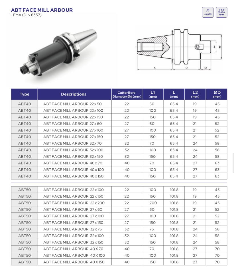The ABT Face Mill Arbor (FMA DIN 6357) is a high-precision tooling solution designed for secure and efficient face milling operations in modern CNC machining. At **Sai Truman Enterprises, Bhosari, Pune**, we offer a comprehensive range of ABT40 and ABT50 face mill arbors engineered for durability, accuracy, and superior performance. These arbors are manufactured with premium-grade materials to ensure high rigidity and minimal runout, enabling smooth cutting and extended tool life. Our ABT face mill arbors are available in multiple cutter bore diameters such as 22 mm, 27 mm, 32 mm, and 40 mm, along with various length configurations to suit diverse machining requirements. The robust design ensures excellent stability during high-speed operations, making them ideal for heavy-duty milling applications across industries like automotive, aerospace, and general engineering. With precise dimensional standards as per DIN 6357, these arbors guarantee perfect compatibility and easy installation with CNC machines. At Sai Truman Enterprises, we focus on delivering reliable tooling solutions that enhance productivity and reduce downtime. Whether you need short or extended length arbors, our range supports optimal performance with consistent accuracy. Choose our ABT Face Mill Arbors for improved machining efficiency, superior surface finish, and dependable results in every operation.