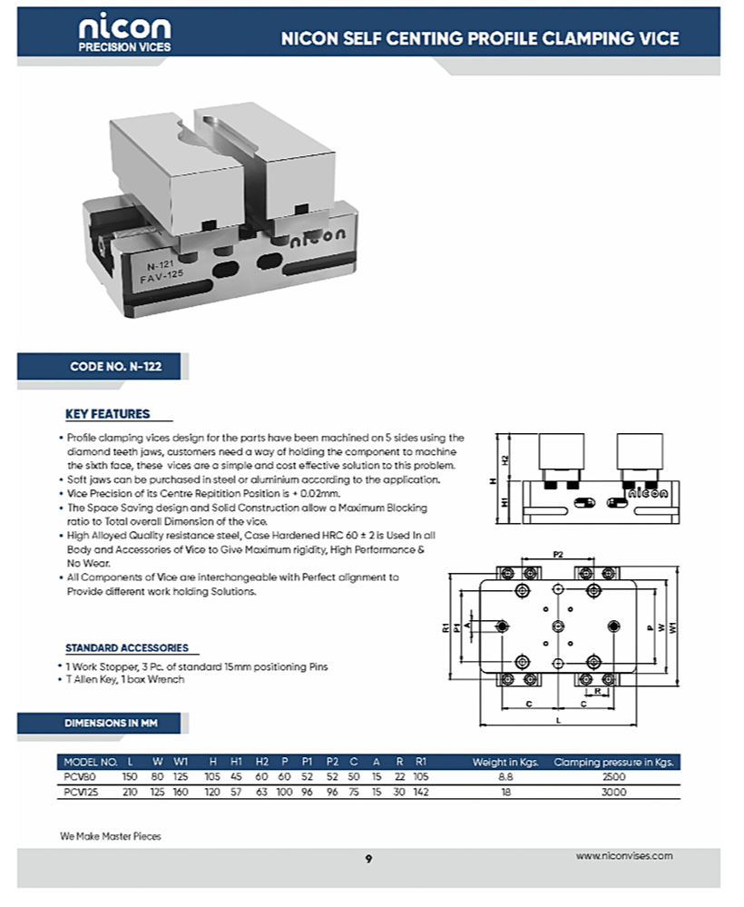 At Sai Truman Enterprises, Bhosari, Pune, we supply the advanced Nicon Self Centring Profile Clamping Vice, engineered for precision machining of pre-profiled components. This innovative clamping solution is specially designed for parts that have already been machined on multiple sides, ensuring secure holding without damaging finished surfaces. The vice features a highly accurate self-centering mechanism with a repeatability precision of up to ±0.02 mm, making it ideal for CNC machining centers and high-precision applications. Its robust construction from hardened alloy steel provides exceptional strength, wear resistance, and long service life in demanding industrial environments. Designed with space-saving geometry, this profile clamping vice maximizes machine table utilization while maintaining a strong and stable grip. The interchangeable jaw system allows users to customize clamping based on job requirements, with options in steel or aluminum for different applications. Its optimized clamping force ensures minimal vibration during machining, resulting in improved surface finish and extended tool life. The vice is suitable for industries such as automotive, aerospace, and precision engineering where consistency and accuracy are critical. With easy setup, reliable performance, and high clamping efficiency, the Nicon profile clamping vice is perfect for batch production and complex machining tasks. Choose Sai Truman Enterprises in Pune for trusted industrial tooling solutions that enhance productivity and precision.