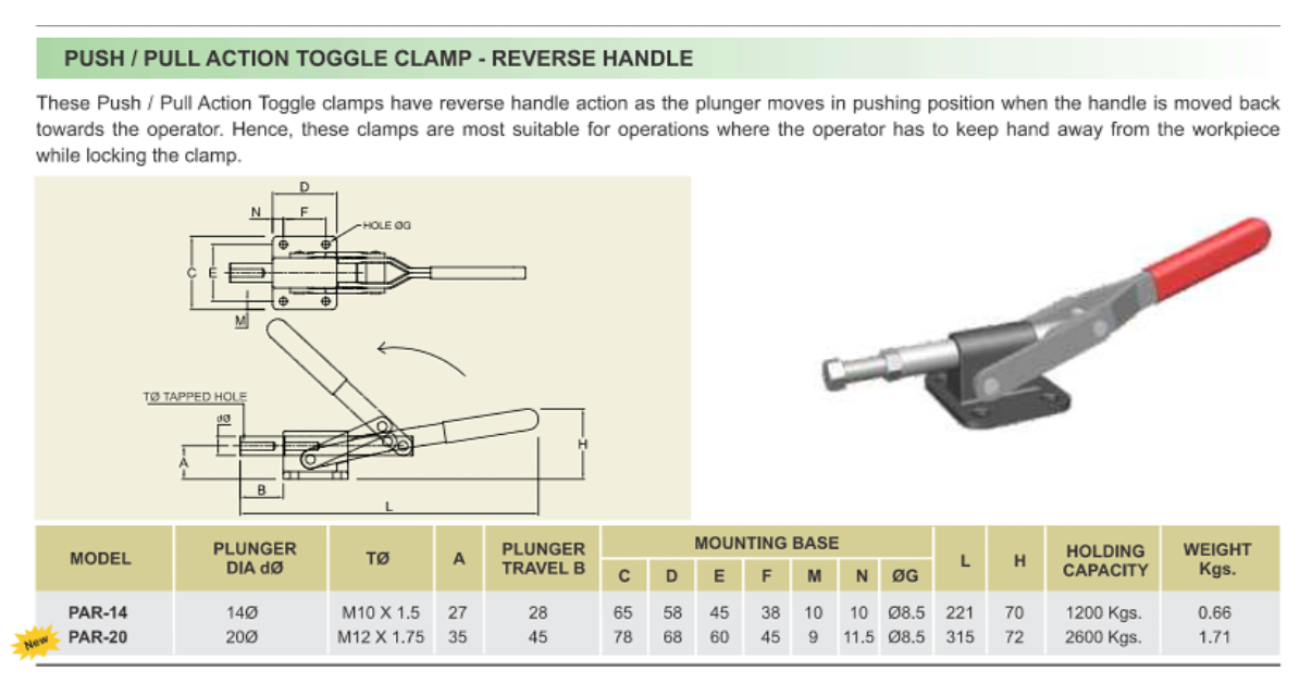 Push / Pull Action Toggle Clamp – Reverse Handle Type is designed for heavy-duty clamping applications where operator safety and strong holding force are required. This clamp features a reverse handle mechanism where the plunger pushes forward when the handle is pulled back, allowing the operator to keep hands safely away from the workpiece during locking. Built with a hardened and ground plunger, it delivers smooth operation, durability, and reliable performance in demanding industrial environments. With a high holding capacity suitable for fabrication, welding fixtures, and assembly setups, it ensures firm and stable clamping. Sai Truman Enterprises, Bhosari Pune, supplies premium quality toggle clamps that provide strength, precision, and long-lasting performance for various industrial and workshop applications.